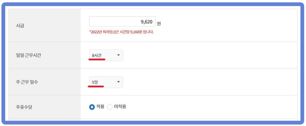 | 주 40시간 이상 | 8시간 X 시급 *40시간 초과 시 40시간 까지만 적용 |