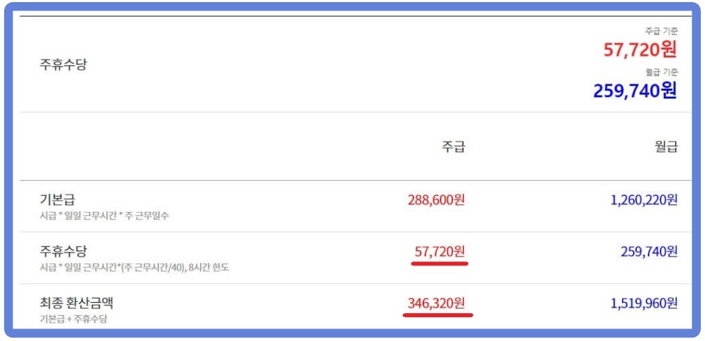 주급 = 9,620원 X 30시간(5일급여) X 30시간 + 57,720원 = 346,320원
