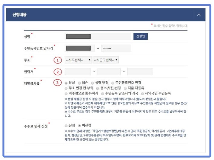 👉개인정보를 입력합니다. 주소, 연락처(정확히 입력 처리완료 등 문자발송)를 적고 재발급사유, 수수료 면제 신청을 체크합니다. 기초생활수급자, 독립유공자, 국가유공자, 한부모가족 등은 수수료가 면제됩니다.