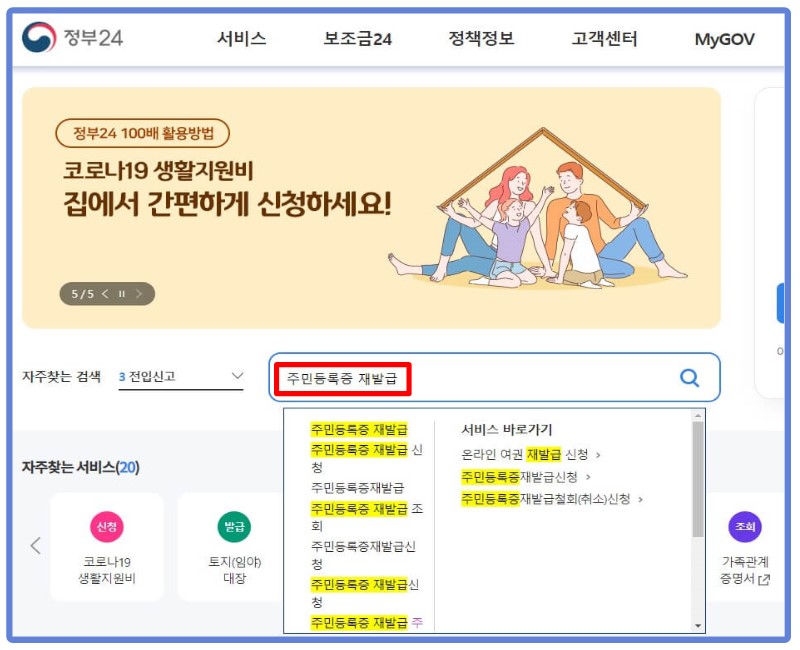 👉위의 링크를 통해 정부24 홈페이지에서 주민등록증 재발급을 검색합니다.