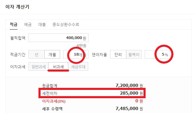 | 은행이자(5%) | 👉적금 이자계산기 바로가기 | 285,000원 | ||