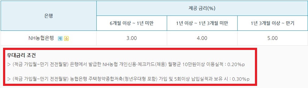 표의 금리는 은행별 평균적이 금리를 나타낸것이며 전국은행연합회 홈페이지에서는 장병내일준비적금 금리를 공시하여 업데이트하고 있습니다. 은행별 0.1%~0.7%의 우대금리를 제공하고 있으니 금리 확인 후 유리한 은행으로 가입하시기 바랍니다.