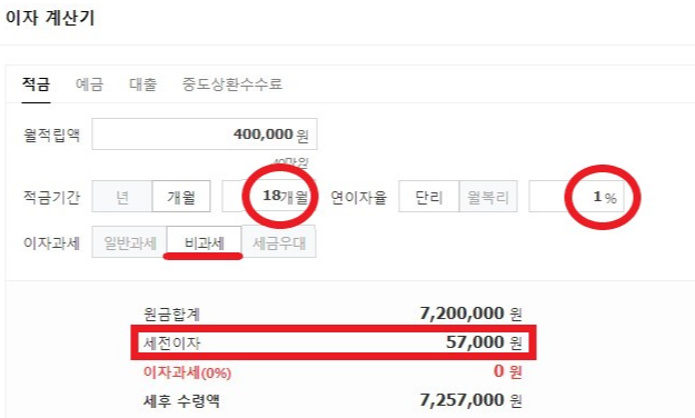 | 지원이자(1%) | 👉적금 이자계산기 바로가기 | 57,000원 | ||