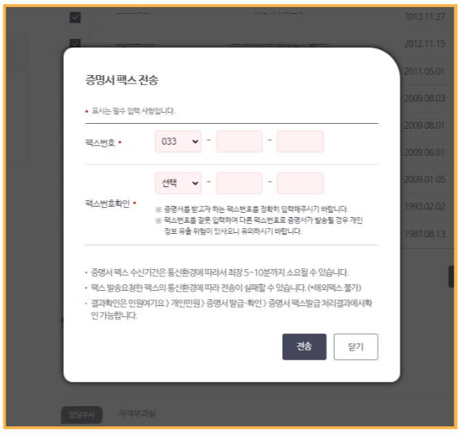 👉팩스 전송을 누르면 팩스번호 입력칸이 나옵니다. 2번 입력해야 하며, 개인정보가 있는 내용을 전송하는 것이니 팩스번호를 주의하여 정확하게 적습니다. 전송을 클릭하면 발송이 완료됩니다. 팩스가 보내지는 데 걸리는 시간은 5~10분 정도 소요가 되며, 결과 확인은 민원 여기요 > 개인민원 > 증명서발급확인 > 증명서 팩스발급 처리결과에서 확인이 가능합니다.