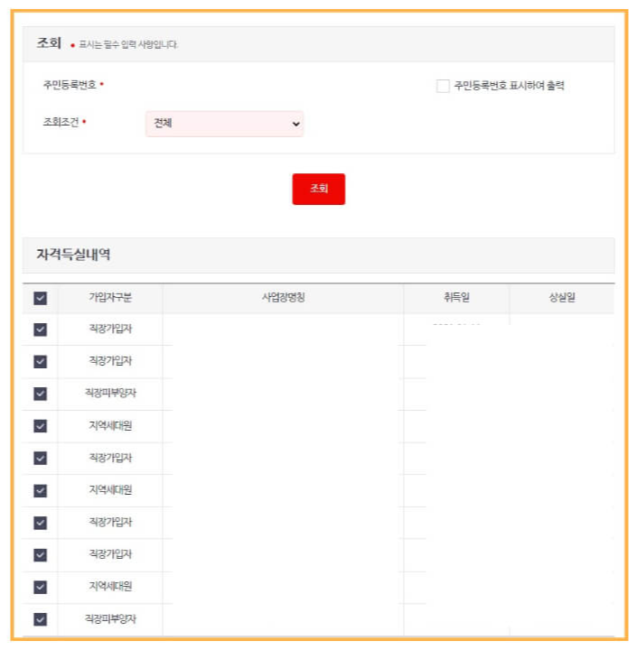 👉자격득실 확인서 조회 내용이 나옵니다. 전체내용이 다 조회되오니 혹시 빼고싶은 내용이 있다면 앞에 체크표시를 해제하면 됩니다. 주민번호 13자리 모두 출력을 원할 때는 주민등록번호 표시하여 출력을 체크합니다.