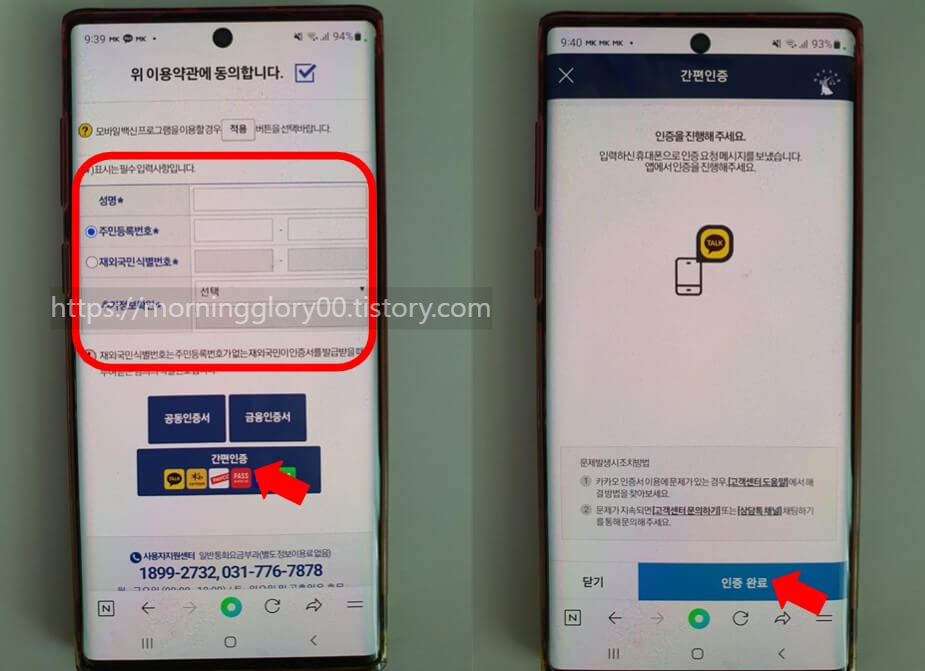 👉 개인정보를 입력 후 간편 인증을 선택합니다. 간편인증 완료 후 인증완료를 클릭합니다.