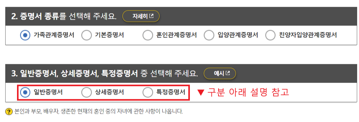 👉가족관계증명서의 종류를 선택합니다. 일반, 상세, 특정증명서를 선택합니다.