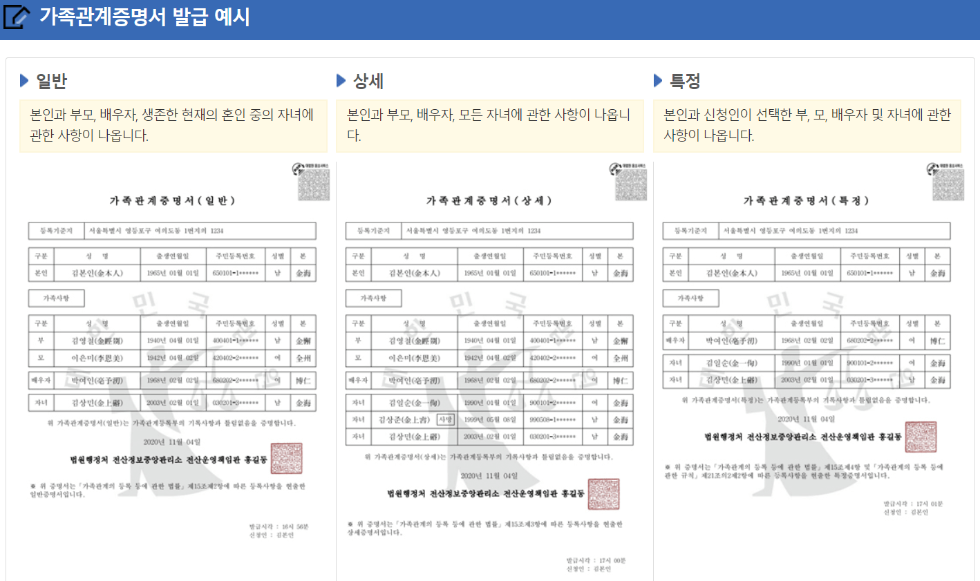 | 일반증명서 | 본인, 부모, 배우자, 생존한 현재의 혼인 중인 자녀 |