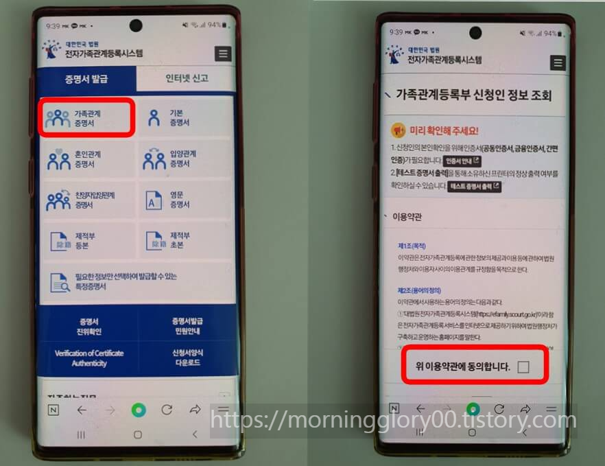 👉포털사트에서 전자가족관계등록시스템을 검색 후 접속합니다. 메인화면의 가족관계증명서를 클릭합니다. 약관을 읽어보시고 동의합니다에 체크합니다.