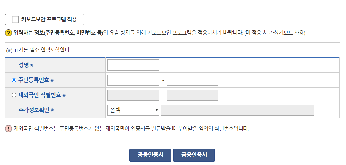 👉본인확인을 위해 개인정보를 입력합니다. 추가정보확인의 경우 부성명, 모성명, 배우자성명, 자녀성명 등을 선택 후 입력합니다.