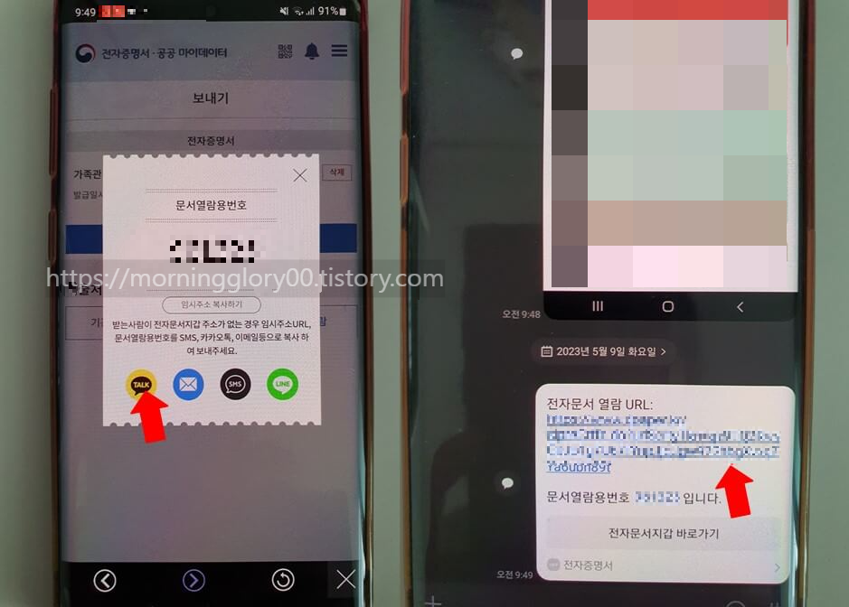 👉1회 열람을 클릭하면 문서열람용 번호가 나오고 상대방에게 메시지와 함께 url주소가 전송되어 바로 열람해 볼 수 있습니다. 1회 열람의 경우 수신자가 딱 1번만 열람이 가능합니다. 다음번에 그 주소를 클릭한다고 해도 주소가 만료되어 열람할 수 없습니다.