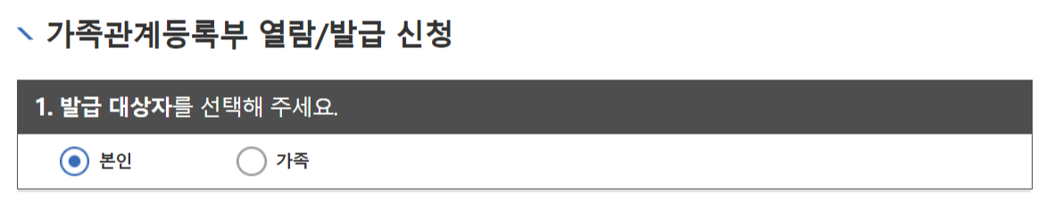 👉가족관계증명서에 발급대상자를 선택합니다. 발급대상자를 누구를 선택하느냐에 따라 가족관계증명서의 내용이 달라집니다.
