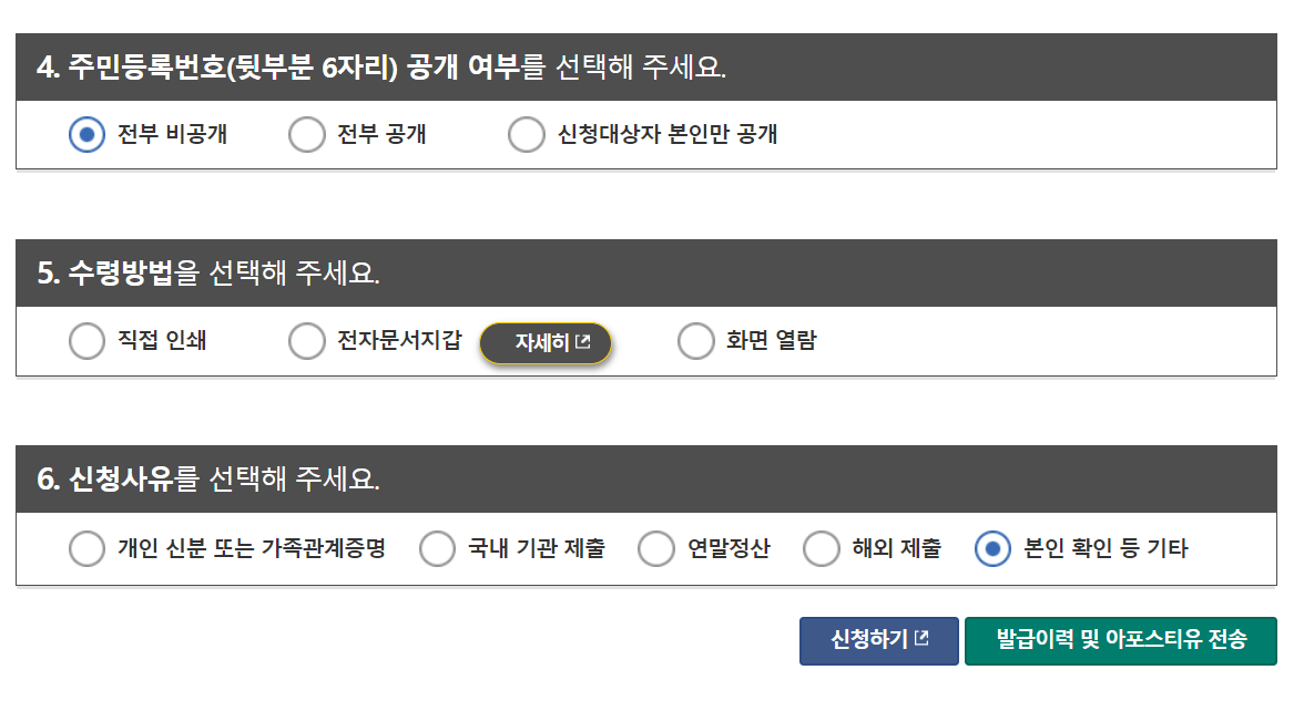 👉발급대상자, 증명서종류, 주민번호 공개여부를 선택합니다.