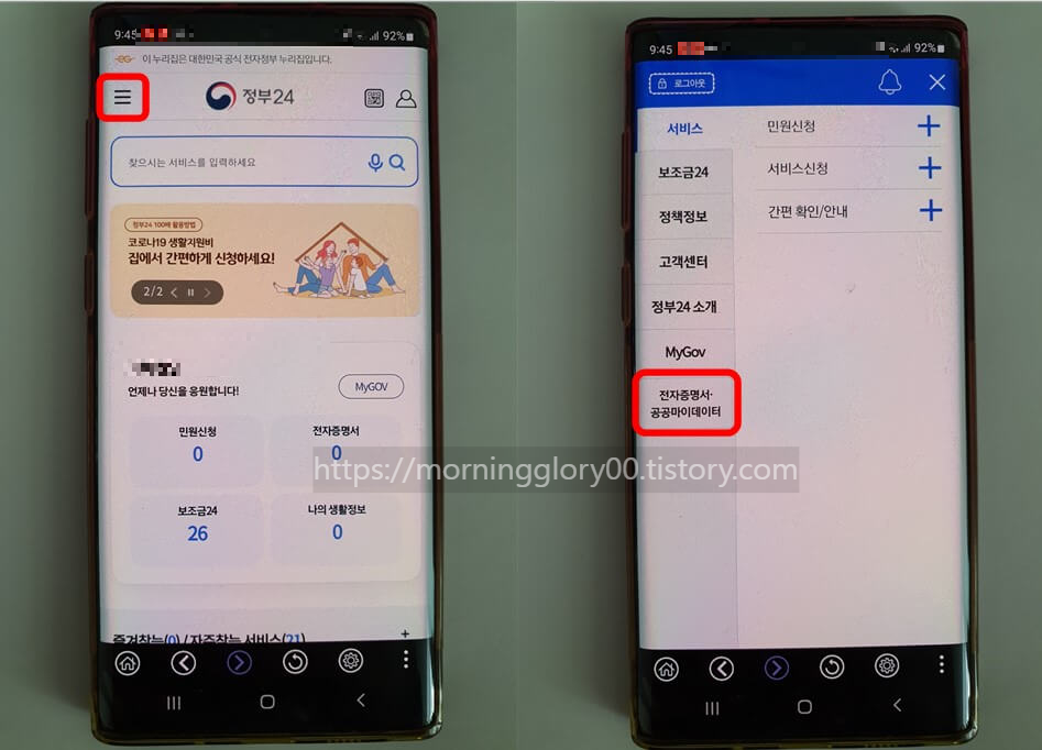 👉전자지갑으로 발급할 경우 정부 24모바일앱에서 내용을 확인할 수 있으며, 위 링크를 통해 앱을 설치하시기 바랍니다. 전자지갑 발급의 경우 제출을 원하는 기관(공공기관, 금융기관, 개인)으로 바로 제출을 할 수도 있습니다. 정부24 메인화면의 선 3개를 클릭합니다. 전자증명서-공공마이데이터를 선택합니다.
