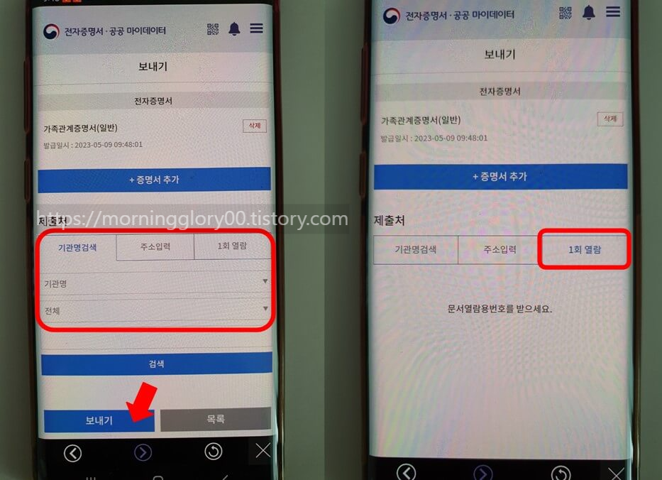 👉본인이 원하는 공공기관, 은행선택 후 보내기를 클릭합니다. 개인에게 보내기 위해서는 1회 열람을 클릭합니다.