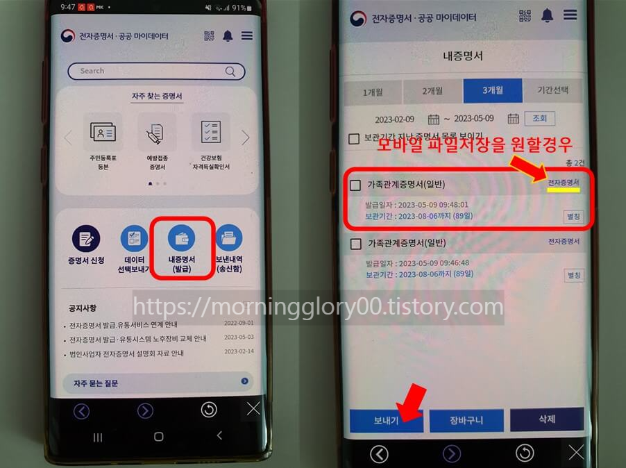 👉내 증명서(발급)를 선택합니다. 내가 발급한 가족관계증명서 목록이 보입니다. 이때 모바일에 파일 바로저장을 원하는 경우 전자증명서를 클릭합니다. 프린트 역시 파일저장 후 프린트해야 합니다. 다른 기관(공공기관, 금융기관, 개인)에게 보내는 경우는 해당 서류 체크 후 보내기를 클릭합니다.