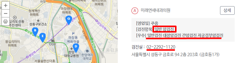 검진항목과 세부 검진내용이 기재되어 건강검진 가능 병원이 검색됩니다. 검진실 연락처가 친절하게 나와 있으니, 전화를 통해 예약을 진행하시면 됩니다.