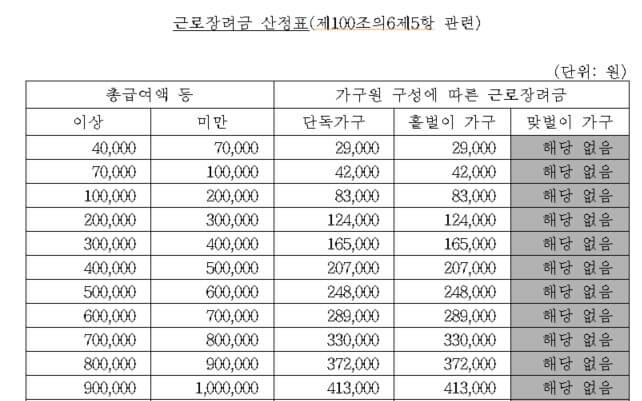 | 가구유형 | 목별 | 총급여액 | 근로장려금 |