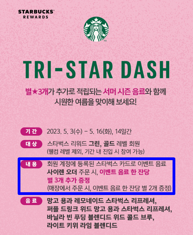 스타벅스에서는 시즌별 새로운 음료를 선보이고 시즌음료 구매 시 별을 추가로 주고 있는데요. 지금은 끝난 이벤트이지만 보시면 스타벅스 카드로 이벤트 음료 *사이렌 오더 주문 시 음료 한잔당 별 3개 추가로 증정한다고 되어 있습니다. (*사이렌 오더 = 매장 방문전 스타벅스 앱으로 미리 주문)