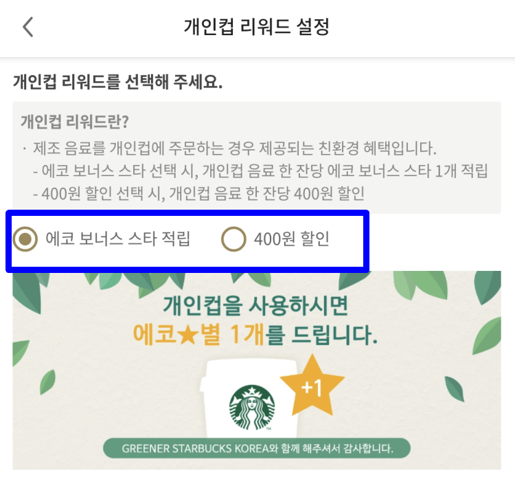 에코별로 적립할 것인지 400원을 할인 받을 것인지는 개인 스타벅스 어플 계정정보에서 에서 미리 설정해놓아야 합니다.