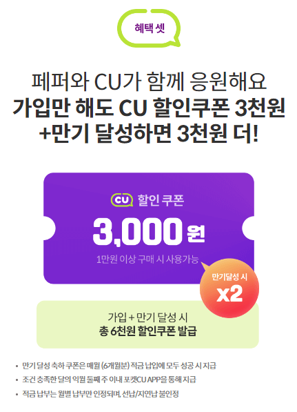 그리고 씨유 페퍼저축은행 적금은 가입 시와 만기 시 씨유 쿠폰을 받을 수 있습니다. 가입 시 3,000원, 만기시 3,000원의 총 6,000원의 쿠폰이 지급됩니다. 쿠폰 역시 지연납이나 미납이 없이 6회차를 납부하는 경우 제공이 가능합니다.