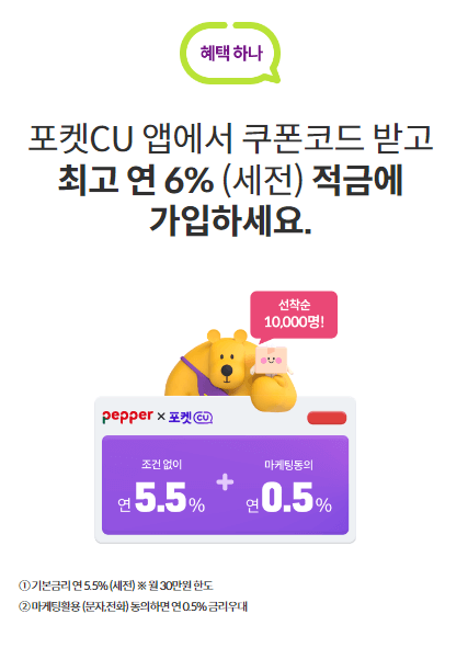 페퍼저축은행에서는 편의점 CU와 손을 잡고 비대면 전용 최대 연 6% 적금을 내놓았습니다. 현재 시중에 나와 있는 적금 중 단연 최고의 금리인데요. 높은 금리혜택부터 CU포인트까지 받을 수 있는 일석이조 상품인데요. 내용 자세히 알려드릴테니, 혜택 꼭 보시기 바랍니다.