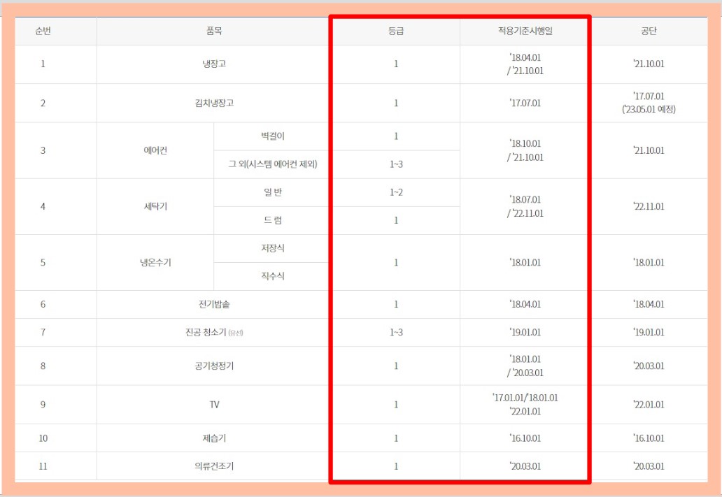 한전 고효율 가전제품 구매비용 지원대상은 11개 품목으로 에너지효율 등급 제품이어야 하는데요. 제품 구입 시 그 기준에 부합하는지 꼭 확인하신 후 구매해야 최종 지원금을 받을 수 있습니다. 등급과 적용기준시행일이 모두 일치해야 합니다.