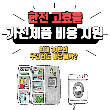 한전에서는 고효율 가전제품 구매비용 지원사업을 통해 사회배려계층의 가전제품 구매 비용을 최대 30만 원 지원해주고 있는데요. 한전 고효율 가전제품 구매비용 지원사업 우리 집도 지원대상이 되는지 확인해 보시기 바랍니다.