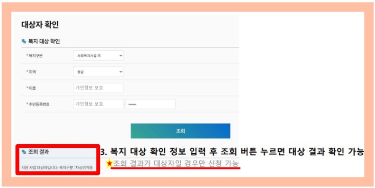 복지대상 확인에 들어가는 개인정보를 입력 후 조회를 클릭하면 됩니다. 조회 결과에 지원사업 대상자 입니다. 라는 메시지가 나오면 시청이 가능합니다.