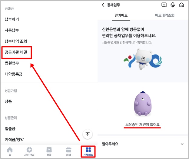 신한은행은 앱에서 자동차 채권 환급금 조회 및 환급이 가능한데요. 모바일 앱 접속 후 하단 전체메뉴 > 공공기관 채권을 클릭 후 조회 및 환급 신청이 가능합니다.