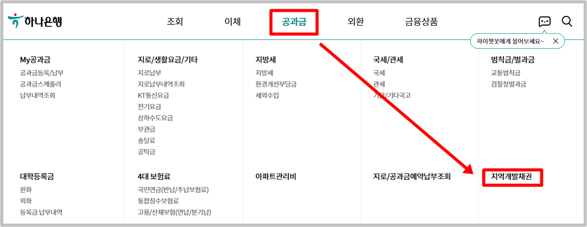 하나은행 홈페이지에 접속 후 상단 메뉴 공과금 > 지역개발채권을 클릭 후 조회 및 환급 신청이 가능합니다.