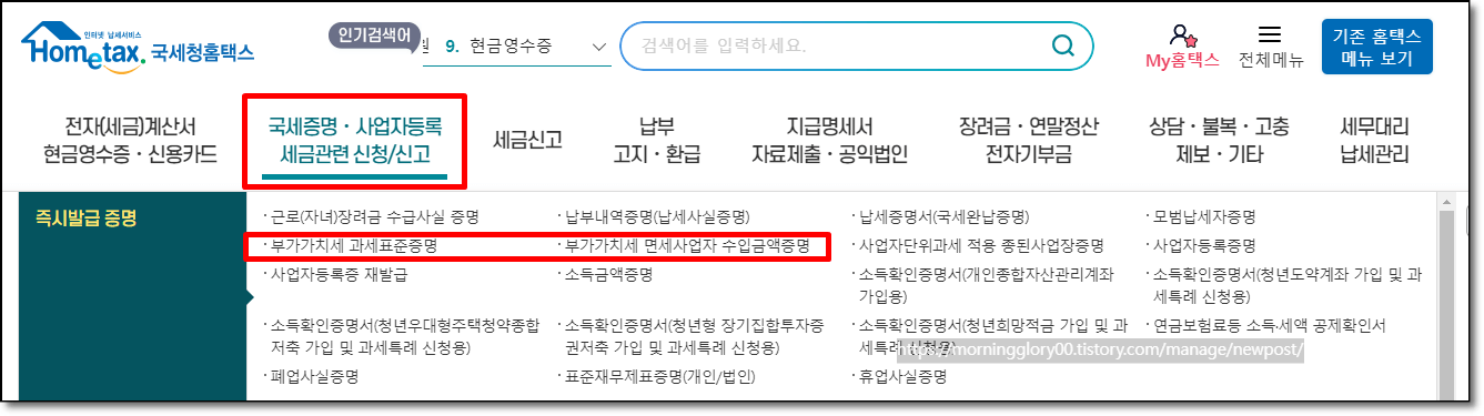 2. 국세증명,사업자등록 세금관련 신청/신고 메뉴를 선택합니다.